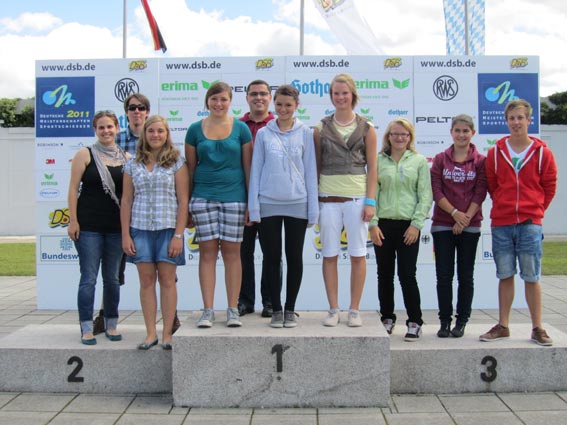 | Eine ganze besondere Leistung ist unserer Schülermannschaft in diesem Jahr gelungen: Barbara Huppert, Jenny Stöller und Sarah Mayr konnten sich gemeinsam für die Deutsche Meisterschaft in München qualifizieren. Mit einer mehr als starken Leistung bei der Bayerischen Meisterschaft (5.Platz mit 554 Ringen, als beste Vereinsmannschaft in Bayern) ist diesen drei Mädels etwas bislang einmaliges, sensationelles gelungen. Somit ging es dann am 28. August 2011 zur Meisterschaft nach München um sich mit den besten Schützinnen und Schützen Deutschland in der Schülerklasse zu messen. |