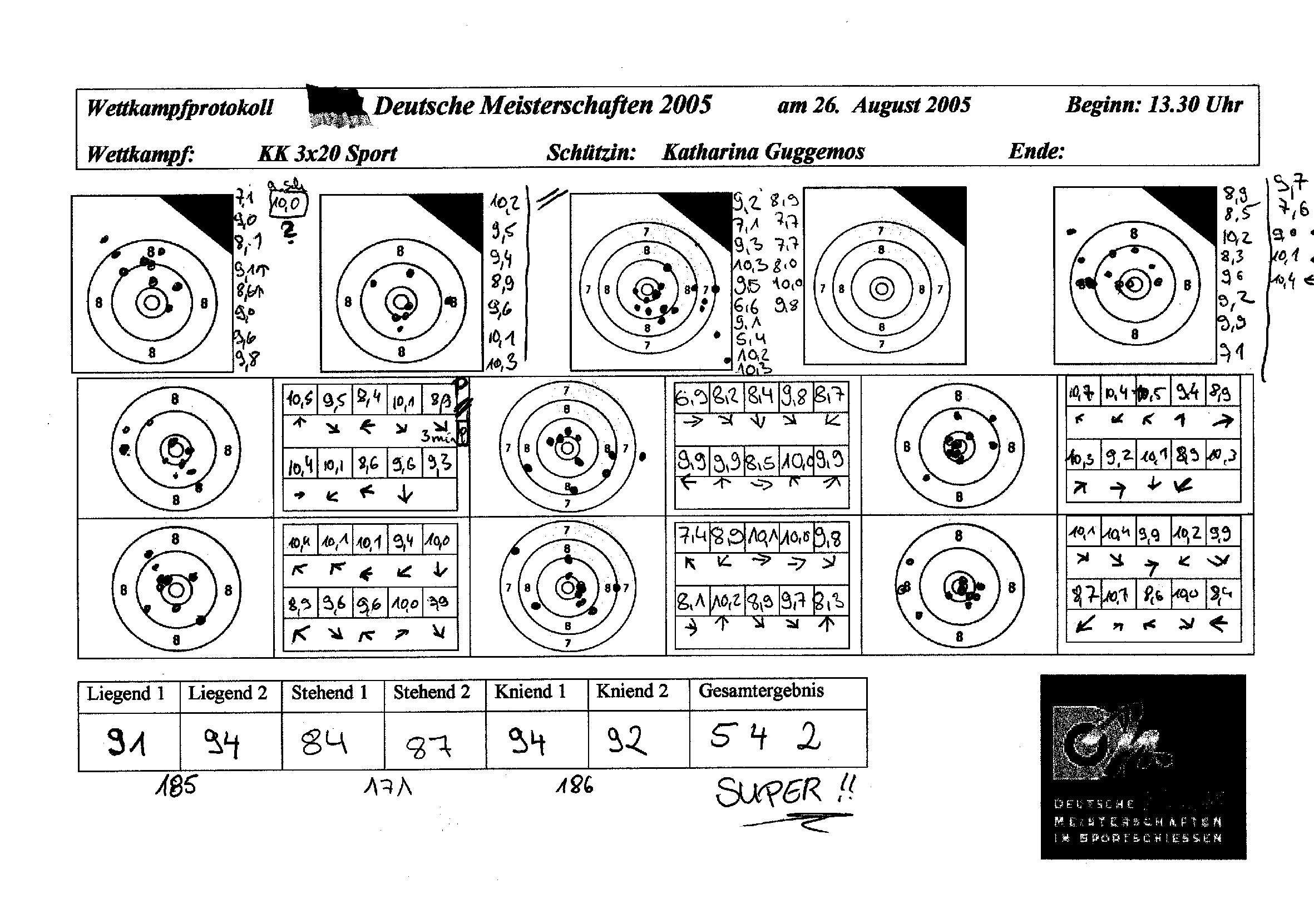 | Juhu! Die Kathi hat es geschafft. Nach kurzer Zitterpartie wegen der komischen limitzahlen stand es fest: Die Katharina hat sich mit dem KK 3x20 für die Deutsche Meisterschaft 2005 qualifiziert. Ein toller, aber auch wirklich verdienter Erfolg! Die Freude war groß. | ![]() |