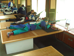 Nach überstandener Bekleidungskontrolle (mit nur einer Materialbeanstandung), die wirklich sehr, sehr schnell über die Bühne ging, kurzer Wartezeit und einem kleinen Bummel durch die Verkaufsstände lag Verena dann bereit zum schießen am Stand! |