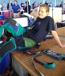 Die erste Hürde (Bekleidungskontrolle) war hier bereits genommen. O-Ton des Kontrolleurs: Mit der Jacke kannst Du weiter schießen, da hast Du nie Probleme! *lachen* Verena sieht die Sache locker wie man im Bild sieht und bereitet sich auf den Wettkampf meditativ vor... |